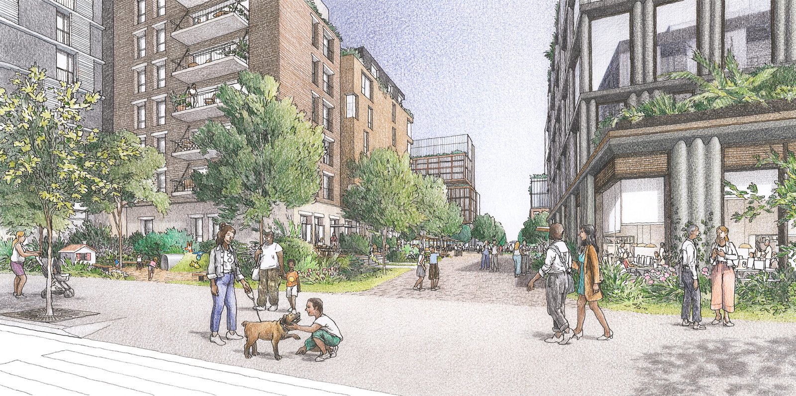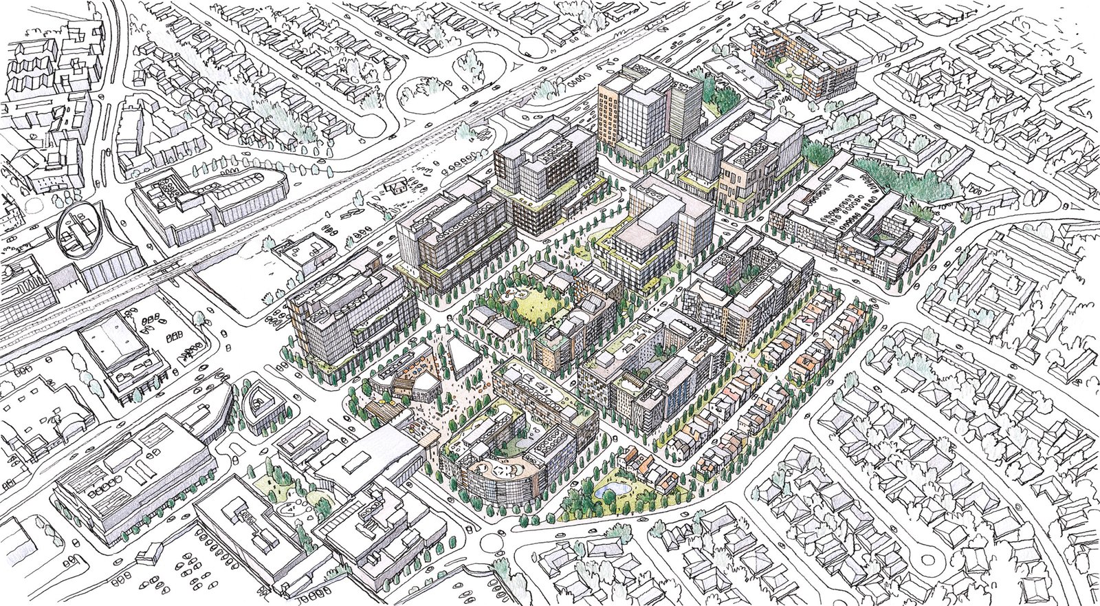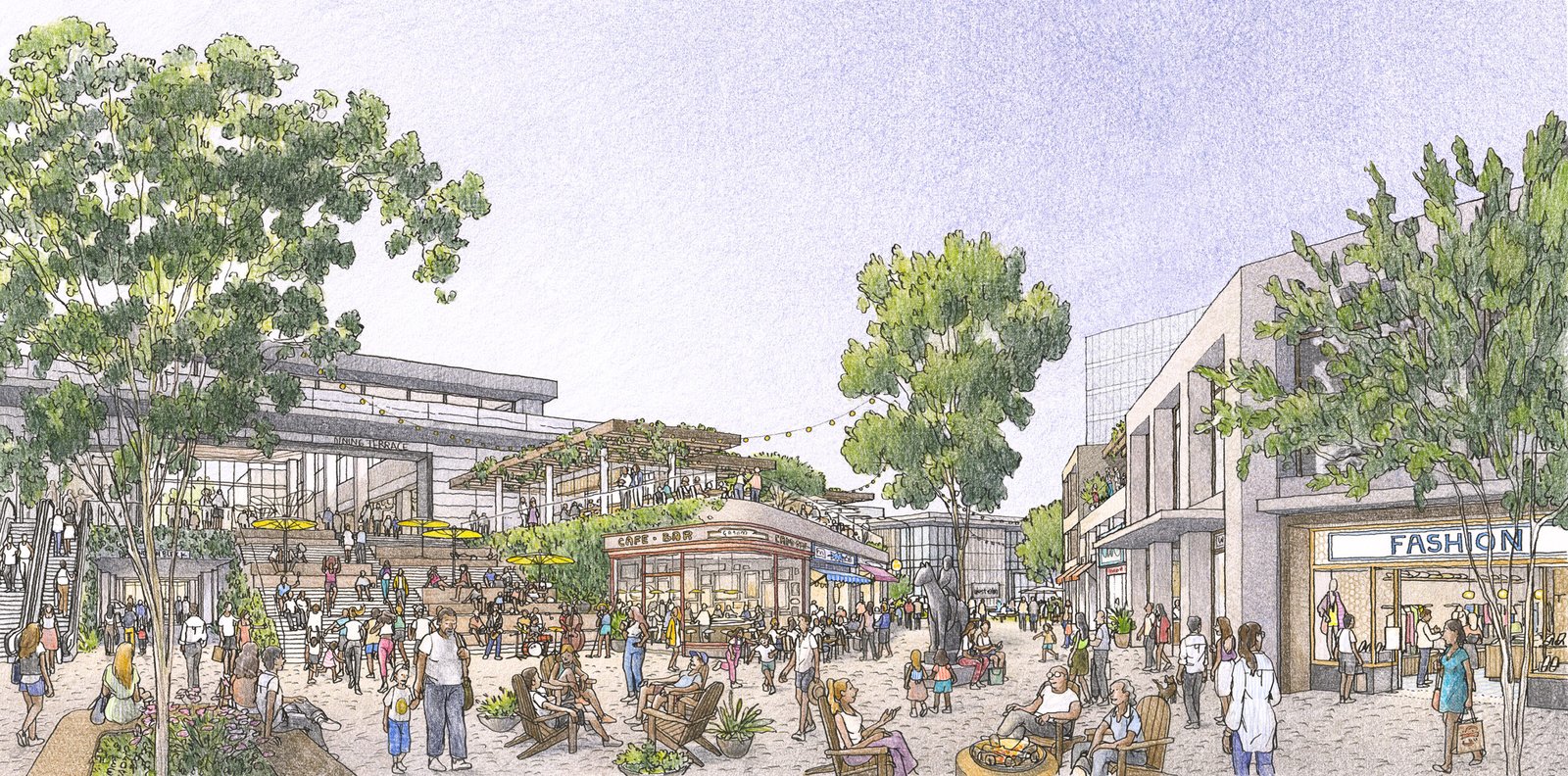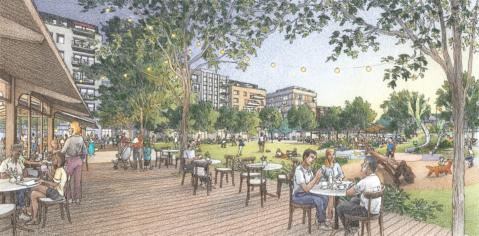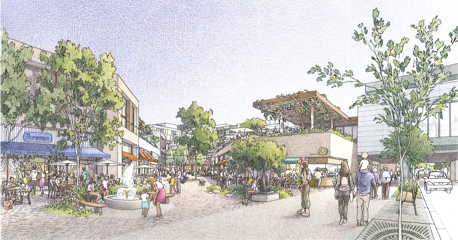 Illustrations for Gehl Architects (San Francisco) masterplan for Hillsdale Shopping (San Mateo, CA). The huge shopping mall is going to be remodeled into a full community, with residences, shops and parks, integrated into the surrounding neighbourhood. Jan Gehl Architects is well known for its human focused designs, walkable cities and communities.